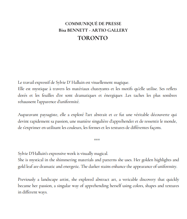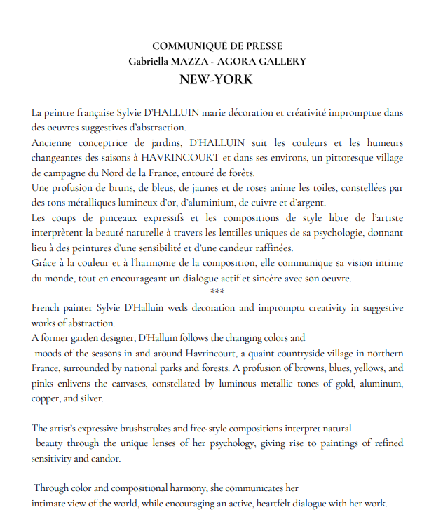» Je travaillais avec mon mari, j’aimais la décoration et travailler de mes mains. Fin 2019, je suis allée au Salon « Maison et objet » à Paris et j’ai vu des tableaux contemporains. Mon mari m’a dit » Mais tu devrais essayer ! » . J’ai acheté des toiles vierges et les ai peintes d’abord au couteau. Je les ai exposées dans la maison et montrées à un encadreur qui m’a dit qu’il en voulait dans sa galerie. » La surprise fut totale mais Sylvie D’Halluin connait très vite un véritable emballement. Des proches lui en demandent. Elle crée un compte sur les réseaux sociaux et est repérée par une galerie de Madrid où elle part avec un portfolio de ses oeuvres et elle y signe un contrat d’un an puis une exposition à Innsbruck en Autriche. Une galerie de Berlin la contacte et l’expose pendant un mois. Enfin c’est une galerie de Manhattan qui lui fait signer un contrat d’un an avec seize tableaux et une exposition d’un mois, en mars 2023, elle expose avec une galerie de Toronto au Carrousel du Louvre, puis toujours à Paris avec deux galeries…